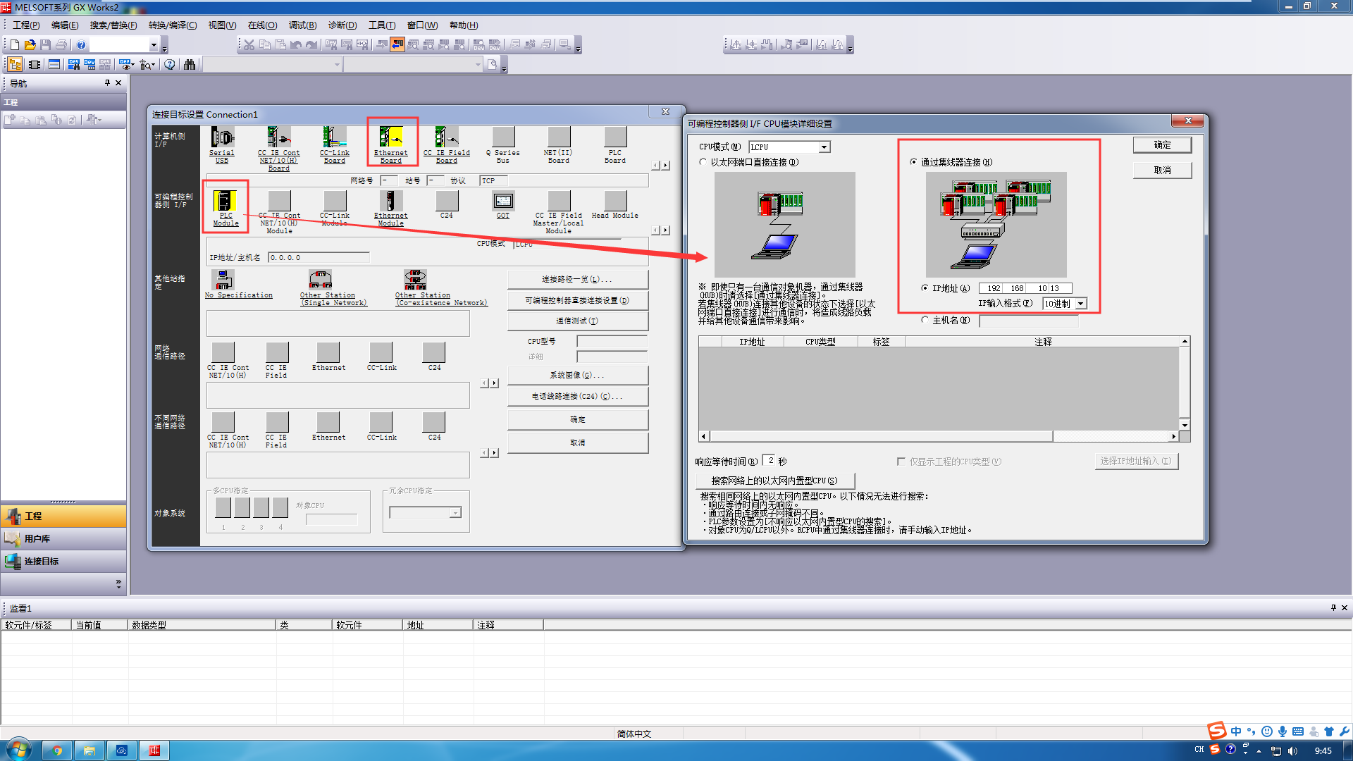 完成后,回到三菱的编程软件里面连接即可。连接方式如下: