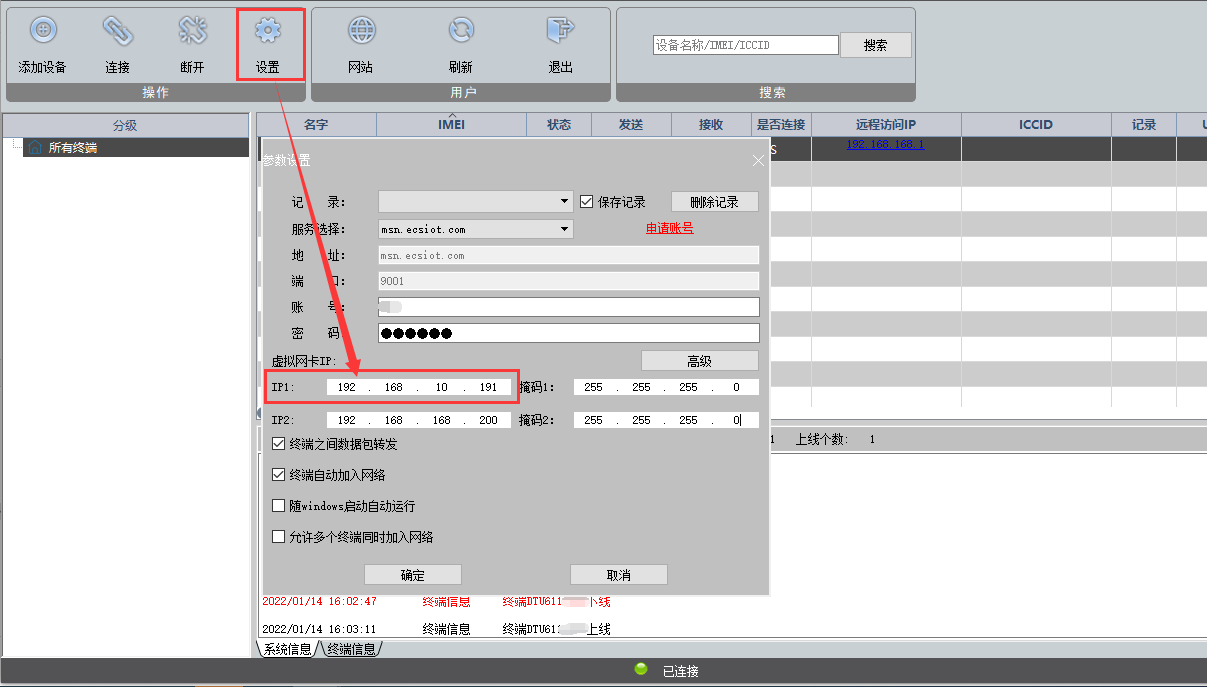 打开虚拟网口工具,点击右上角添加终端,弹出框,将模块侧面的IMEI号输入即可,(注意:添加的前提