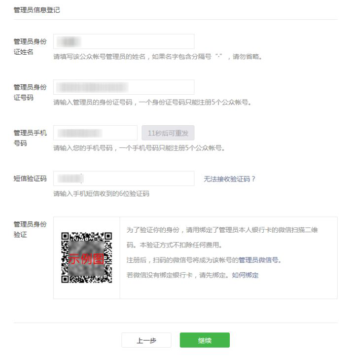 ③管理员信息登记,填写身份证名称、身份证号码,手机号码,短信验证码,微信扫码绑定完成后点击继续