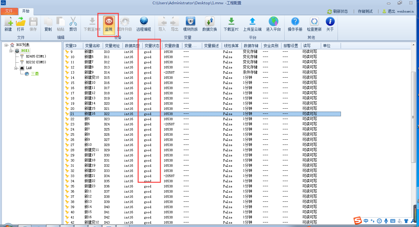 通过ECS软件里面的监视,点击监视后,会出来IP地址,具体使用的IP与上述步骤中的“下载至BOX”方式一样,变量状态为“good”表示PLC和模块通讯正常。如下图: