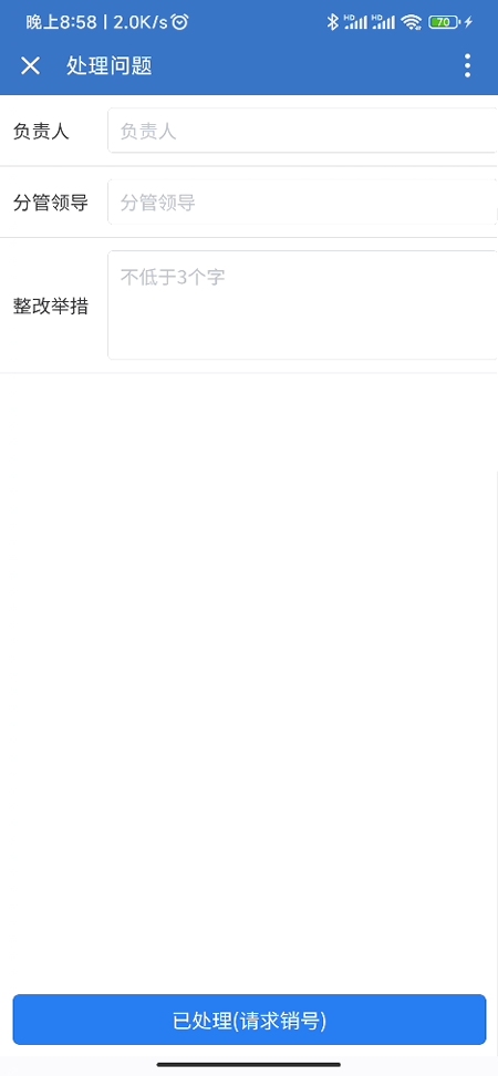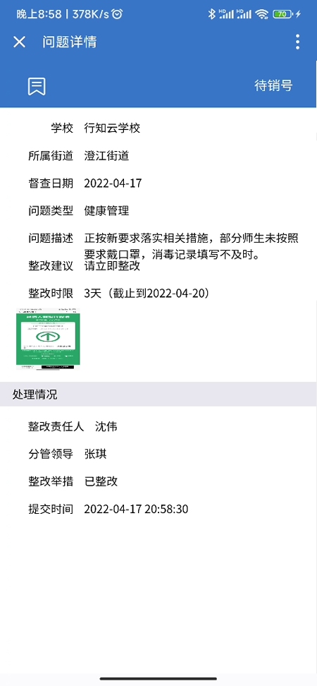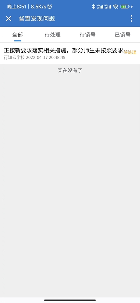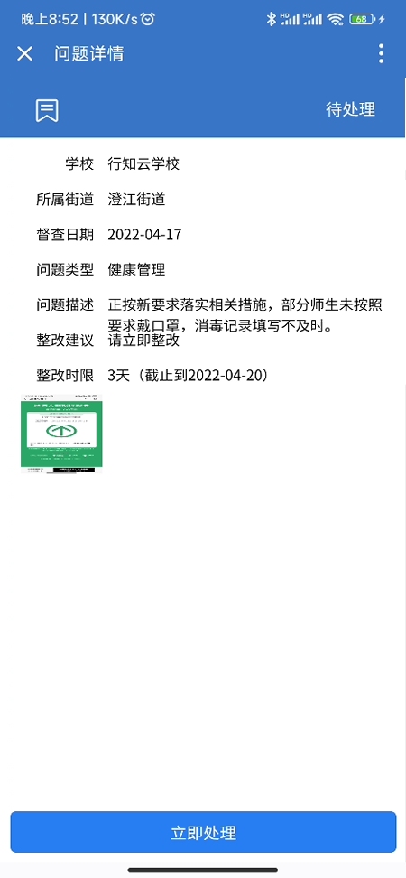 1. 点击首页-督查发现问题,可以查询到需要学校处理的问题2. 点击问题标题,可以查看问题详情3. 公文流转的学校负责人可以点击“立即处理”,处理该问题。4. 输入相应的负责人、分管领导、整改举措,请求销号,等待督查人员销号