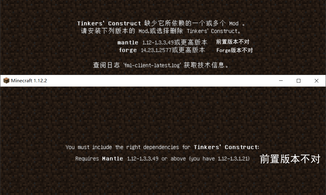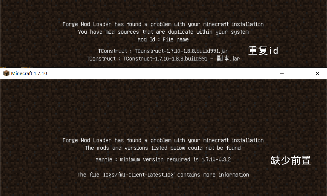 常见的几种就是模组缺少前置、模组id重复、Forge版本不对、模组前置的版本不对