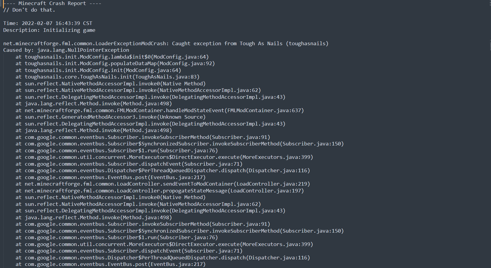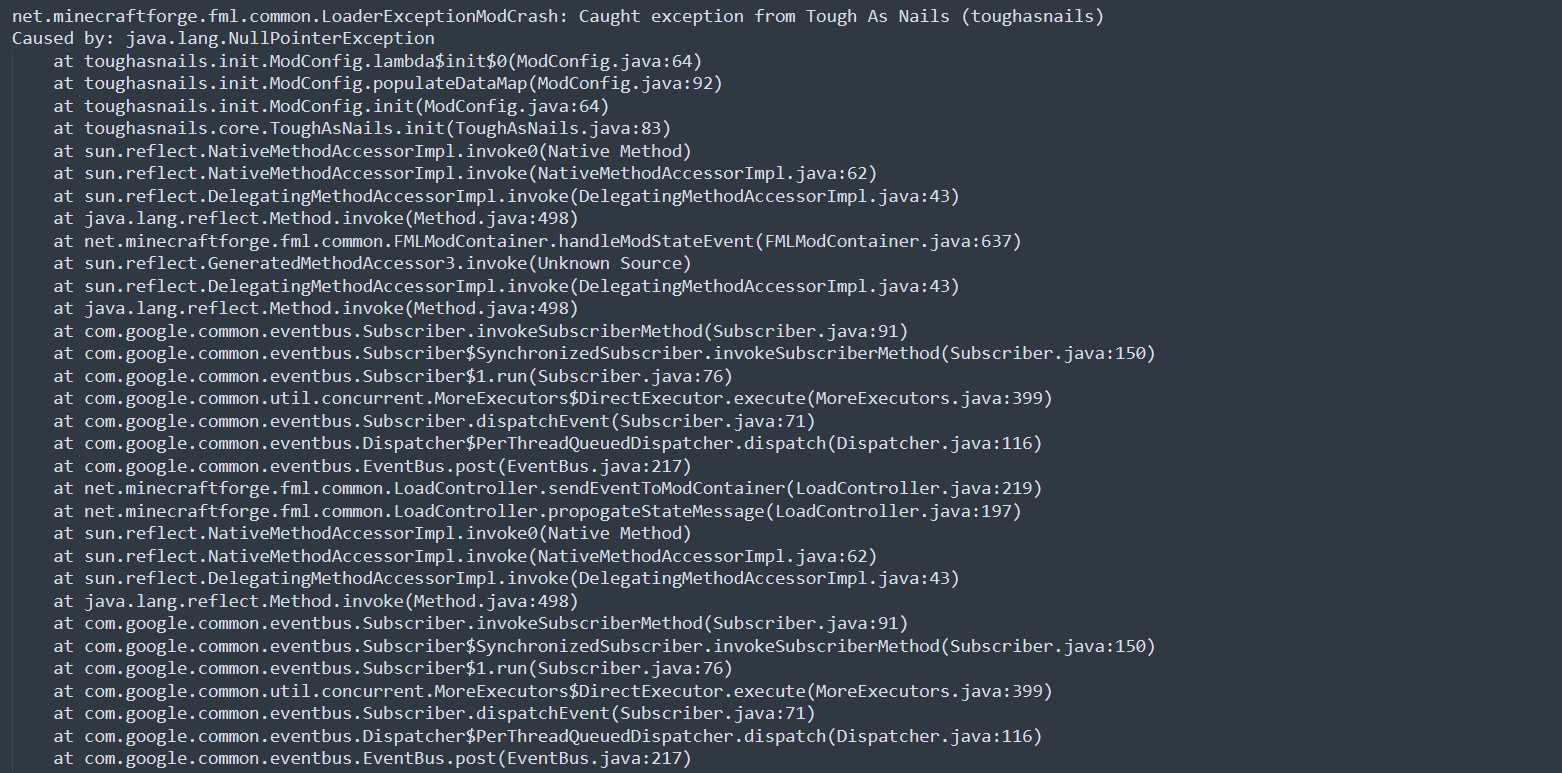 我们来看第一句话,这句话往往是最有用的,小数点后的那句话LoaderExceptionModCrash翻译过来是加载模组崩溃,我们再看冒号后的那句话Caught exception from Tough As Nails (toughasnails)括号中阔选的便是模组的名字,你可以通过删掉这个模组或者接着看下面的[栈帧](https://blog.csdn.net/ylyuanlu/article/details/18947951)来解决崩溃。