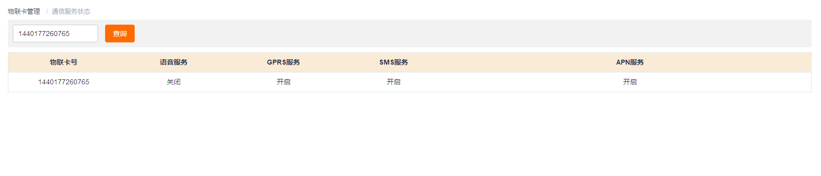 ## 通信服务状态查询 可以根据物联网卡号码进行查询,物联网卡通信服务状态。 1. 点击左侧的信息面板-物联卡管理》通信服务状态》 2. 根据‘物联网卡号’搜索sim卡的详情通信服务状态信息。如下图所示: