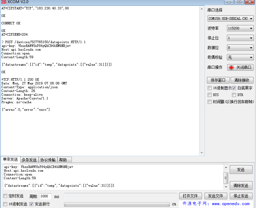 {"errno":0,"error":"succ"} //平台回应信息,显示发送成功