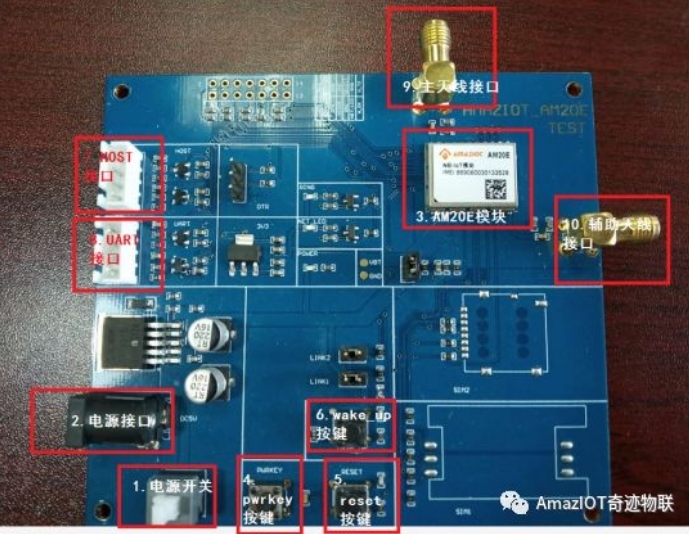 将电源,天线,串口板接到AM20E开发板的电源接口,天线接口和UART接口,串口版另一USB口接PC,按下电源开关,开发板上开机灯power点亮。再长按pwekey 按键1s以上,如下图所示: