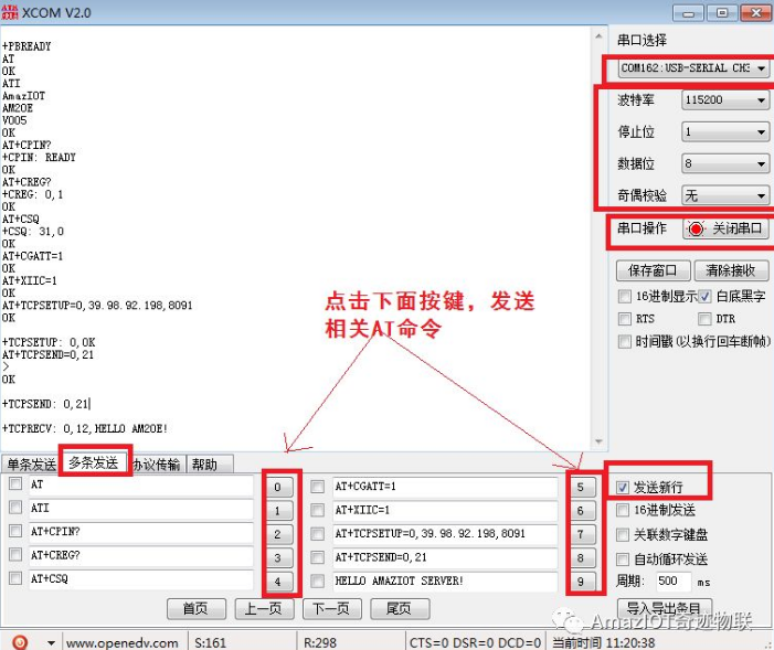 打开XCOM串口助手,按下图配置相关参数,然后发送相关AT命令连接服务器。