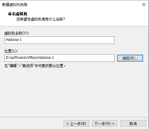 命名虚拟机名称、选择保存的位置,点击下一步: