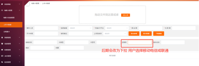 入库操作:一键导入入库,同时要选择卡所属运营商以便实现对不同运营商的卡都可以统一管理。