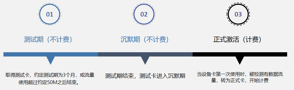 企业客户在设备生产环节就安装SIM卡,出厂前需要设备联合调试。期间支持免费测试期/沉默期,可降低库存成本。