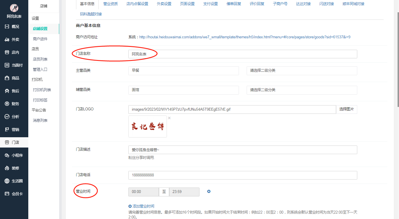 2.第二步 建好门店后 我们可以看到门店基础信息 需要补充完整 设置好后我们看下图继续设置