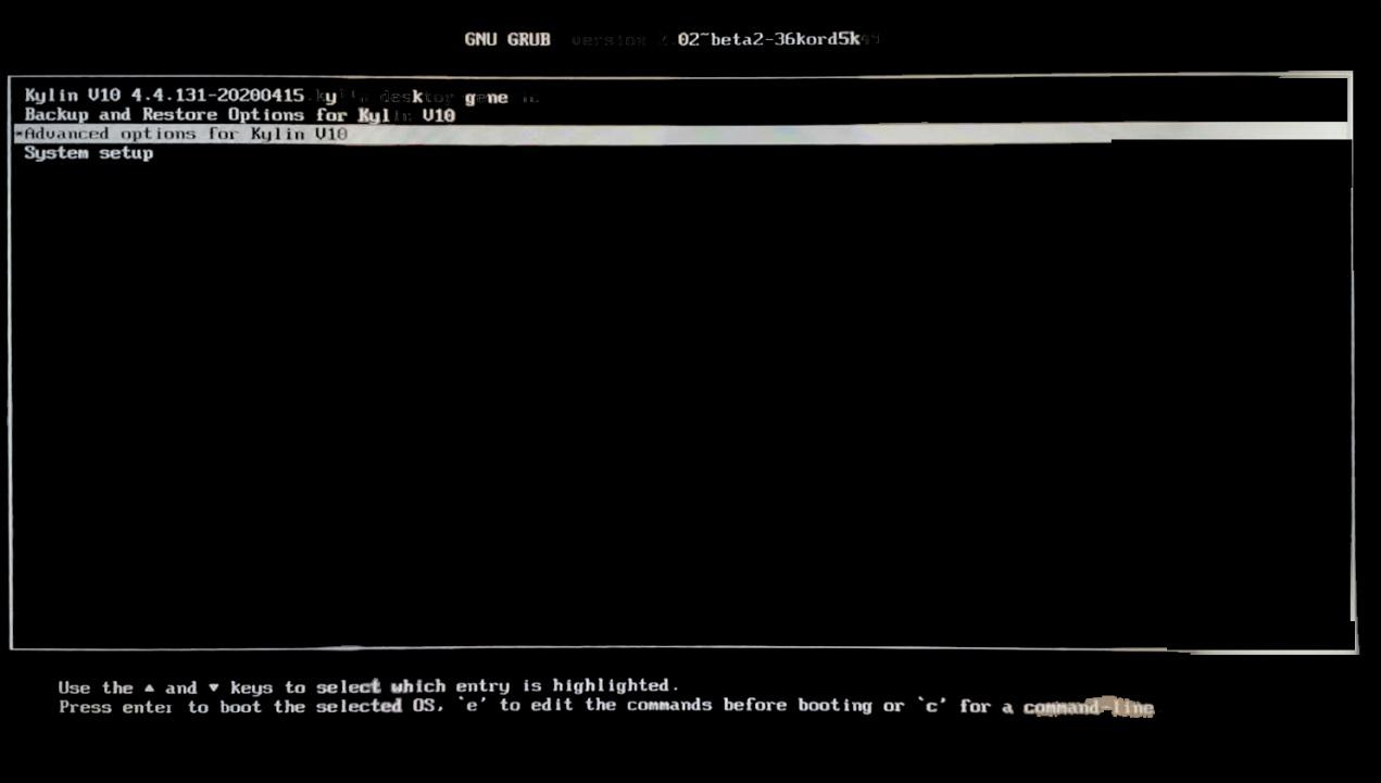 1.开机至 grub 菜单,上下键光标选择第三项*Advanced options for Kylin V10(高级选项),如图所示: