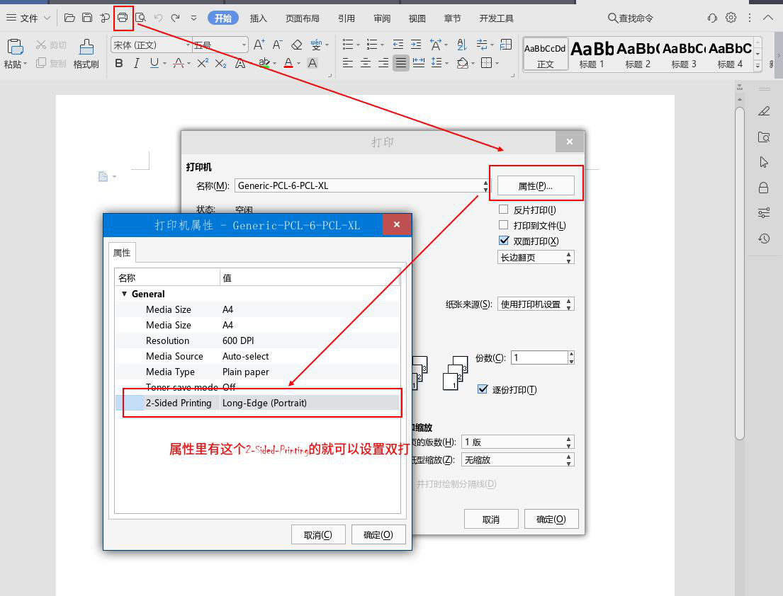 打开文档,点击打印,点击属性,找到名称2-Sided-Printing这个属性,修改off状态属性。  同时,打印机也需要进行设置,选择想要的双面打印即可