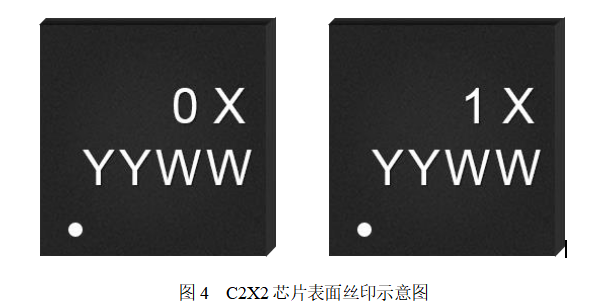 C2X2 芯片表面丝印需打印方向标示(Pin1),标示为实心圆点,打印内容分两行显示,右对齐,0----消费级,1----工业级,X----供应商代码,YYWW 生产年号周号。