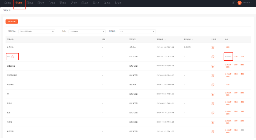 页面是可以直接套用系统提供的模板页面,也可以自定义装修页面,可将任一个页面设为店铺首页。