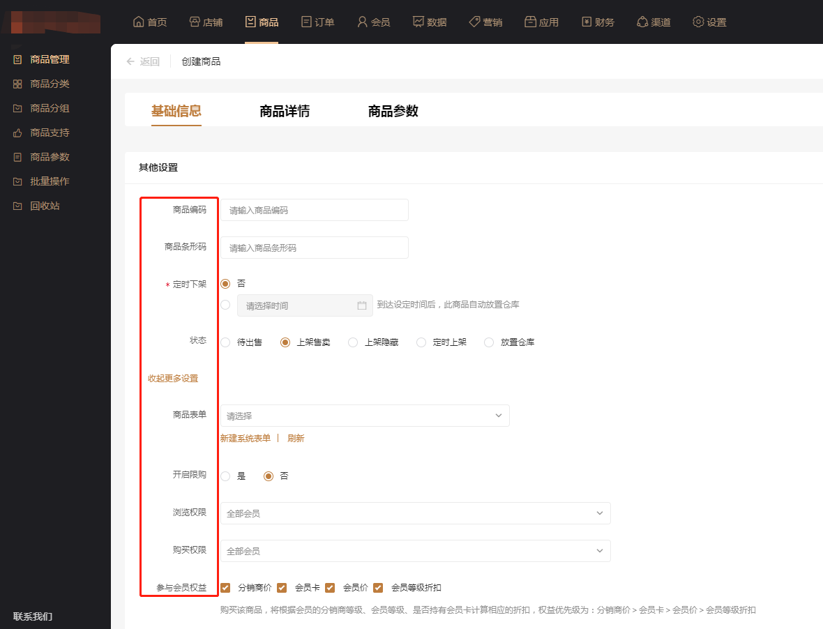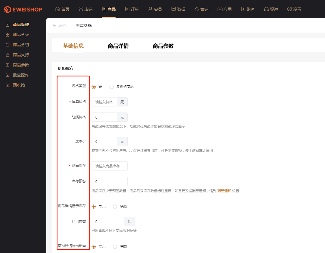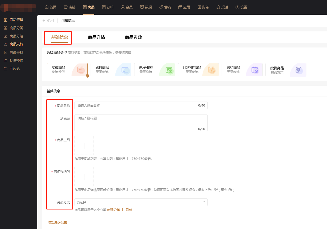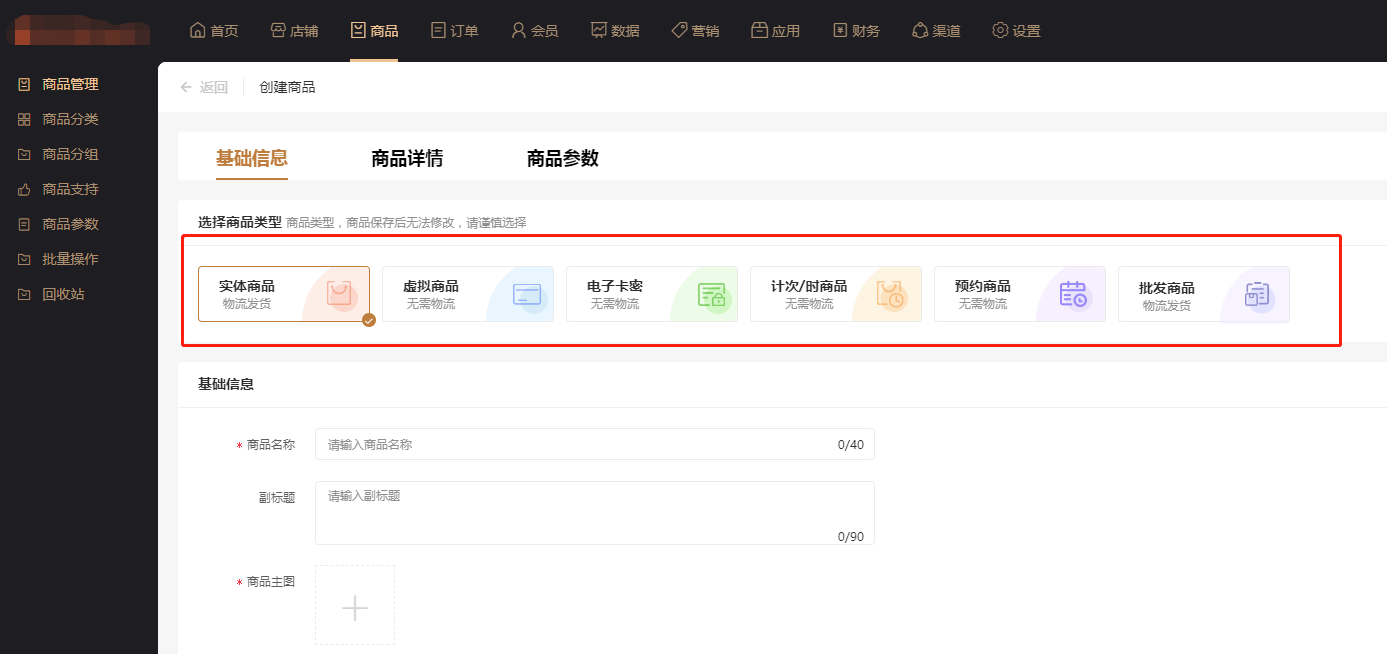 实体商品、虚拟商品、电子卡密、计次时商品、预约商品、批发商品的创建。