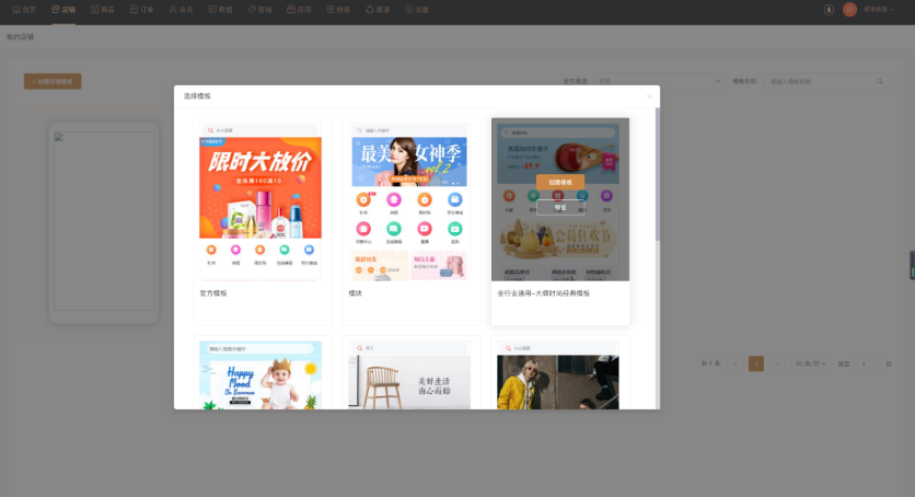 点击创建店铺模板,勾选需要的模板创建(模板需在管理端套餐中开启或用户中心购买)