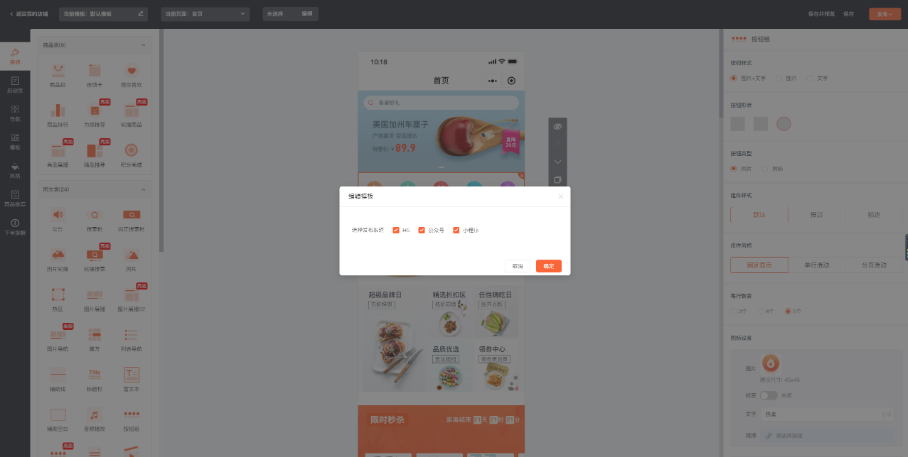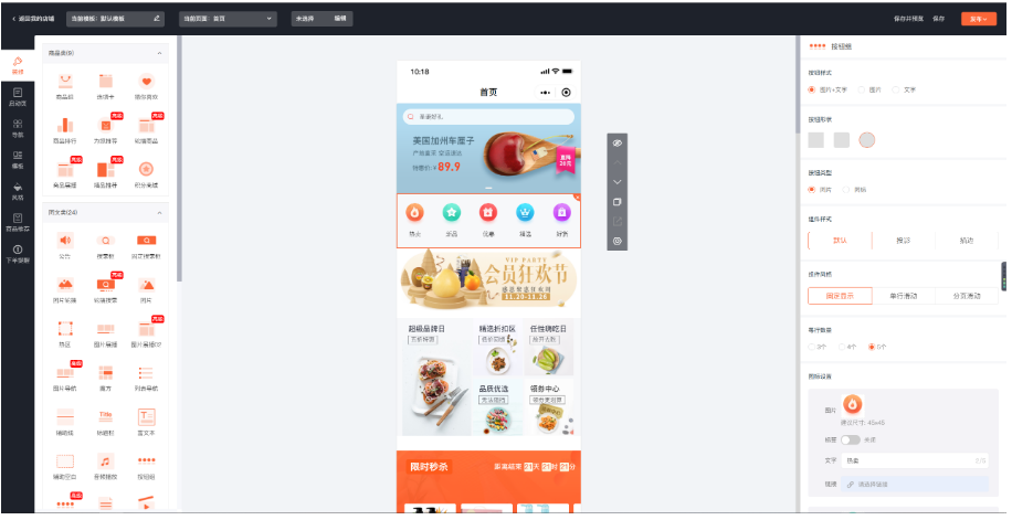 布局说明:左侧装修列表依次分为:商品类、图文类、营销类、其他组件,可自由选择元素进行设计装修