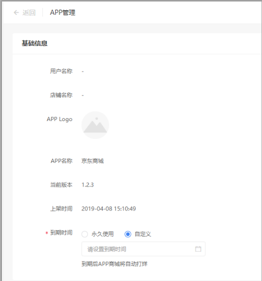 点击设置可以显示店铺的基础信息和升级记录,可以在这里设置APP端店铺的到期时间。