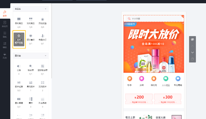 4.   2)选择APP端后,进入店铺装修页面,在左侧元素中会显示该渠道中不支持的组件。