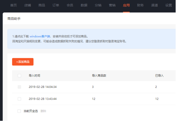 yunmashop 的商品助手插件可以一键获取淘宝、天猫、京东,商家可将相应的店铺中的商品利用助手工具批量获取并导入商城商品的仓库中。但需注意的是需要在您的电脑上运行商品助手客户端,再回到商城内进行抓取