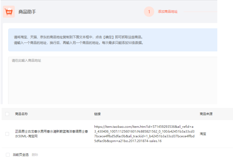 点击任务列表添加商品,系统会弹出新的页面进行抓取商品,输入需要抓取商品的地址(每次最多添加50条数据)