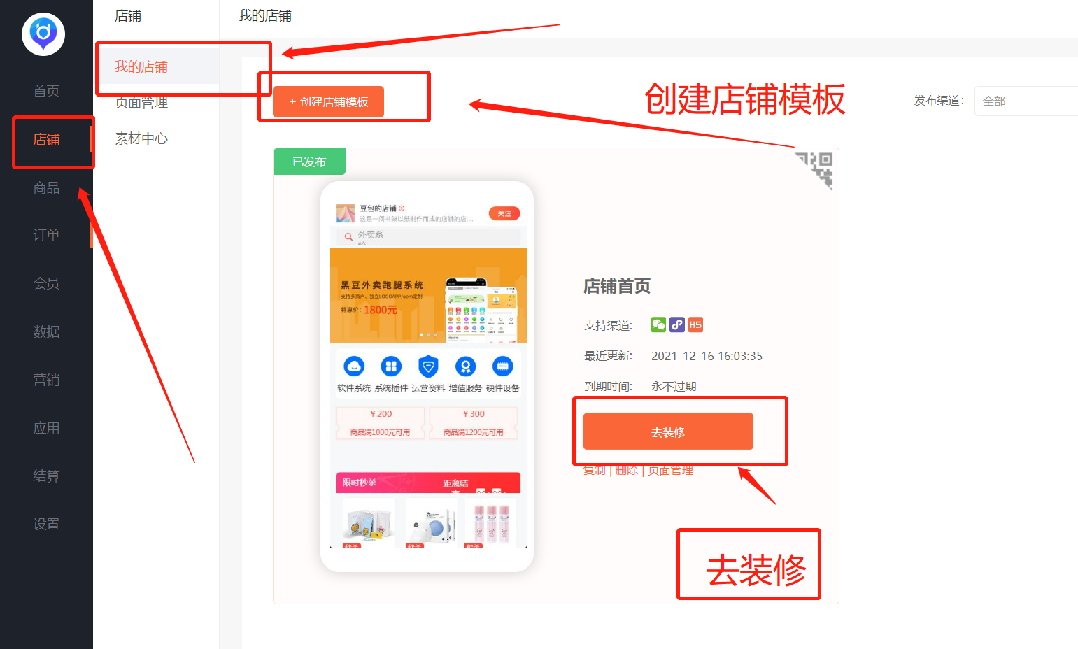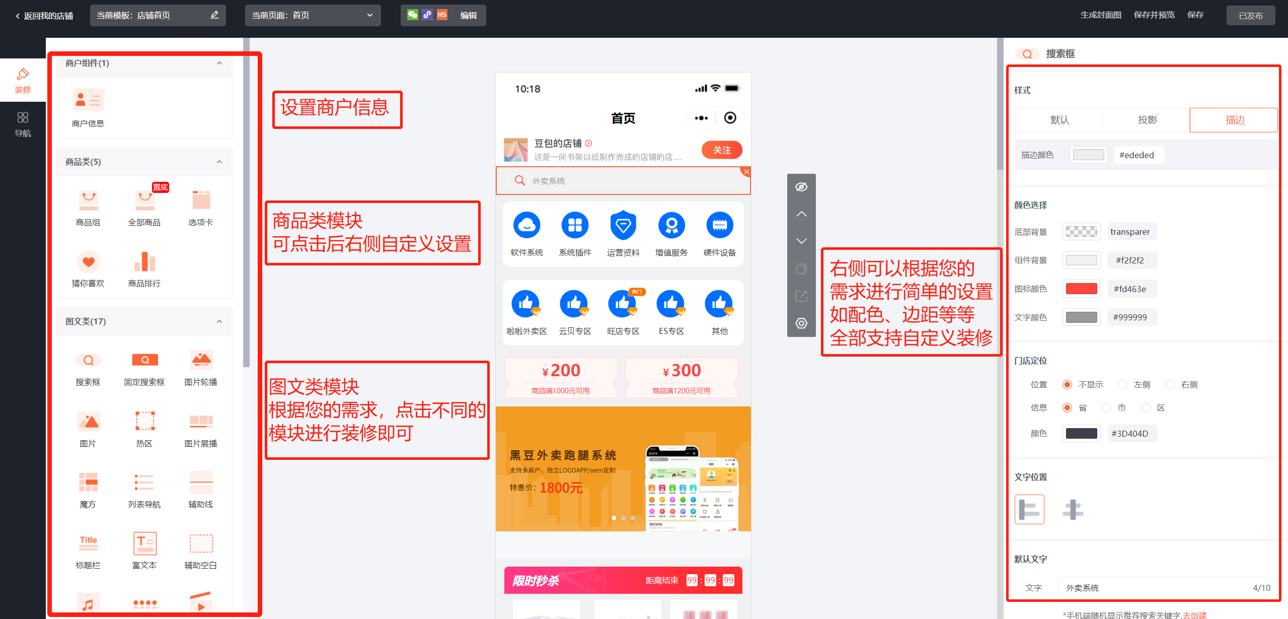 2.进入装修页面,可根据您的需求进行自定义的装修设计,所有的页面功能均支持自定义。可视化自定义装修,如图。