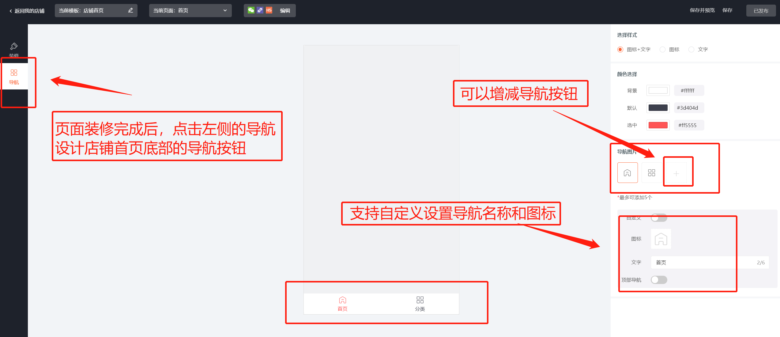 3.页面装修完成后,设置底部导航,方便引导客户。如图
