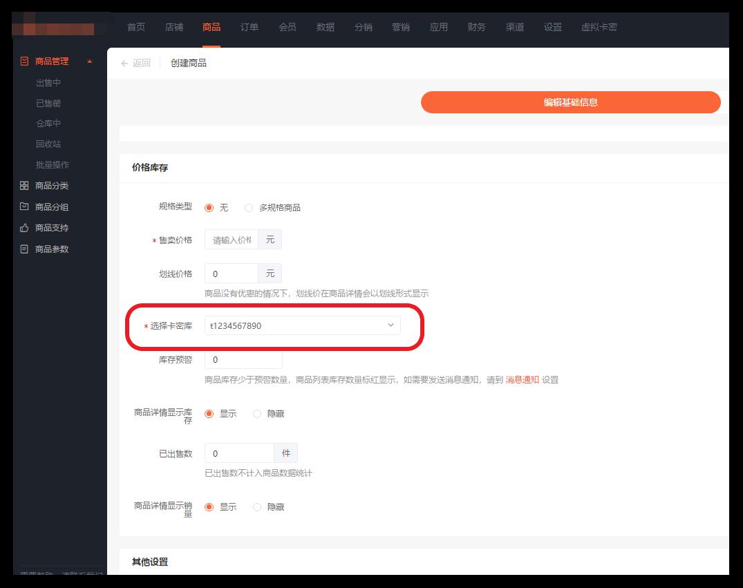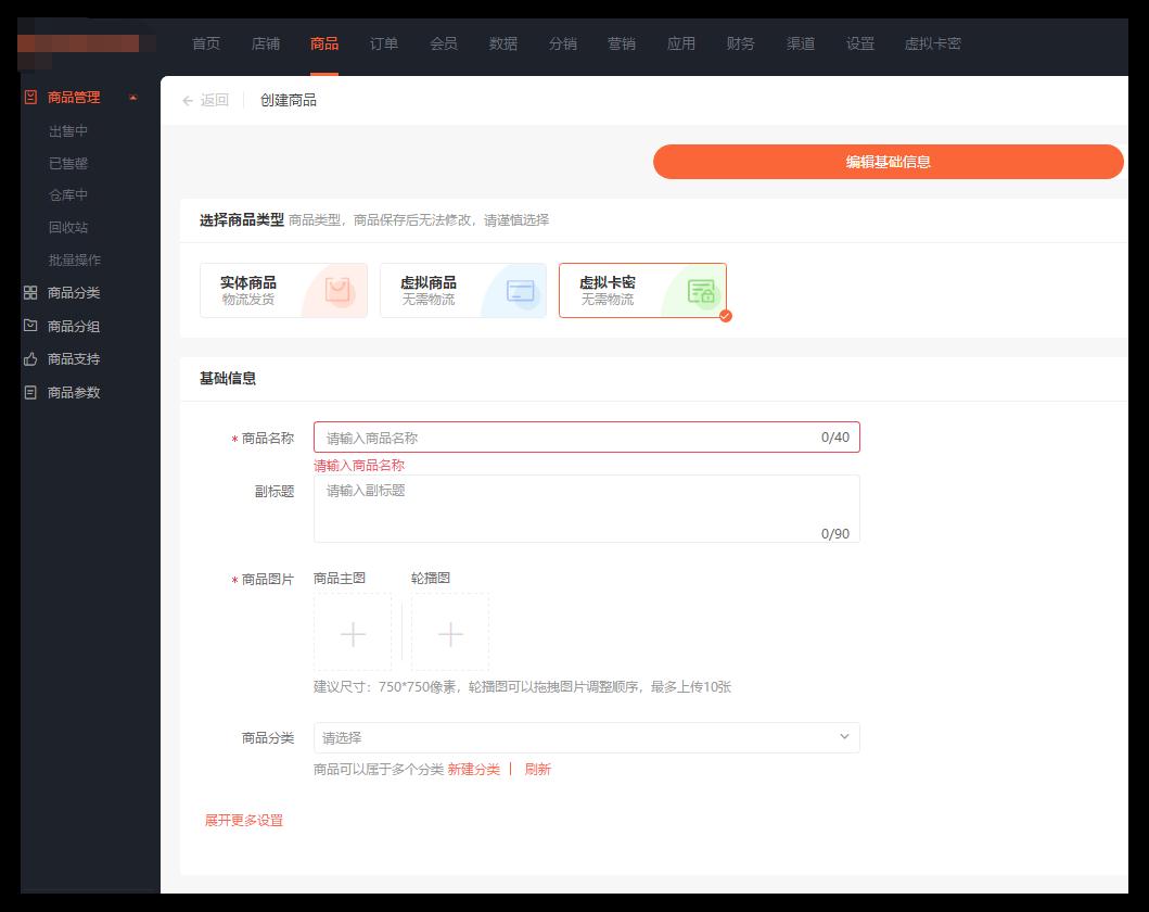 添加虚拟商品也是在商品中,点击【创建商品】,商品类型选择【电子卡密】;