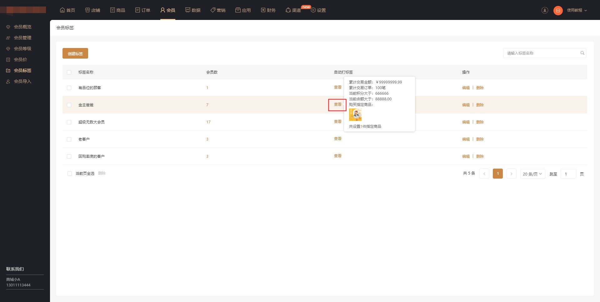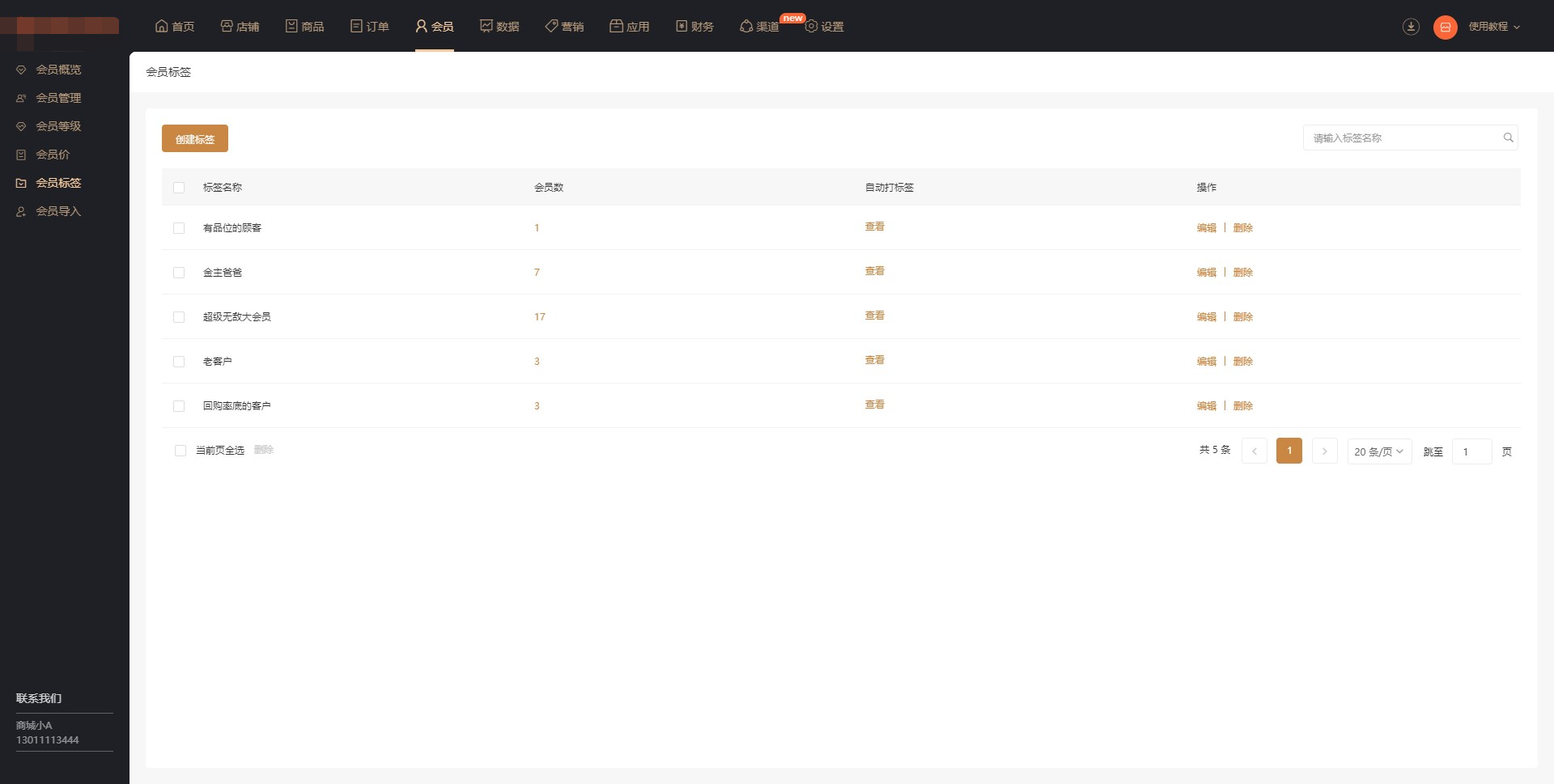 1.会员标签:展示标签名称、会员数等信息;可对标签进行编辑和删除