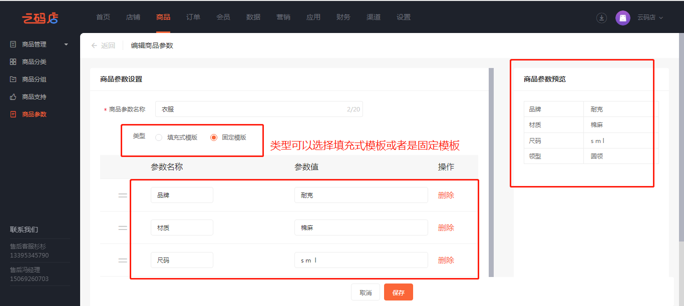 商品参数拿衣服做个说明就是类似于衣服的品牌,材质,尺码,面料,花型图案,领型,颜色等,您可以根据您自己经营的商品,设置相对应的商品参数,