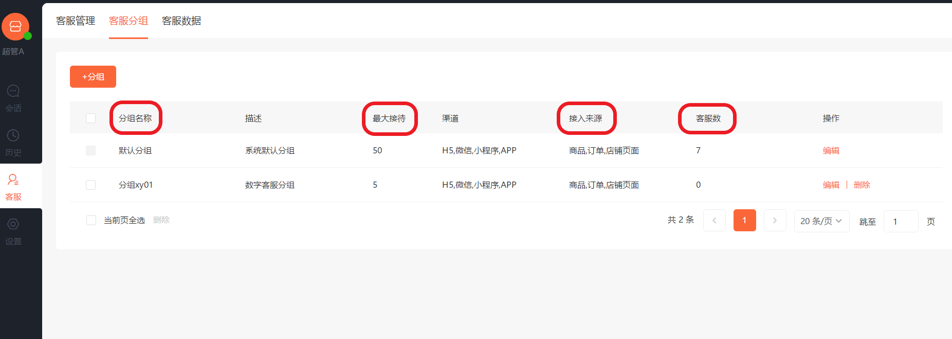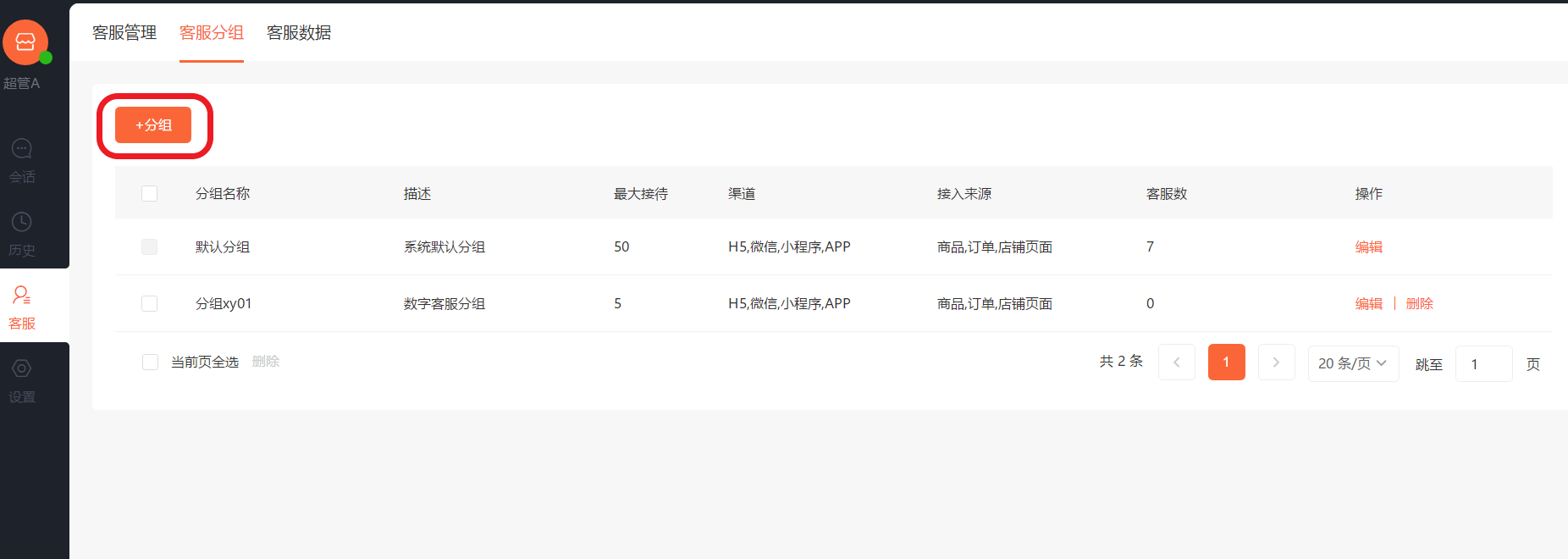 删除:弹出二次确认弹窗,确定后删除分组(客服数为0时可删除)