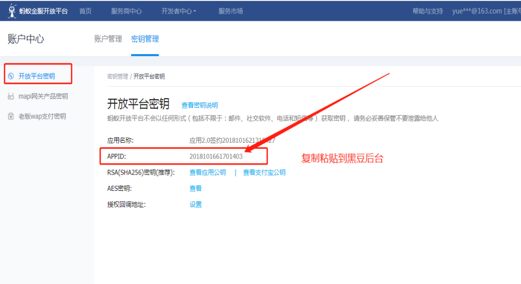 13.把对应的id和支付宝公钥复制粘贴到我们黑豆云码店的后台