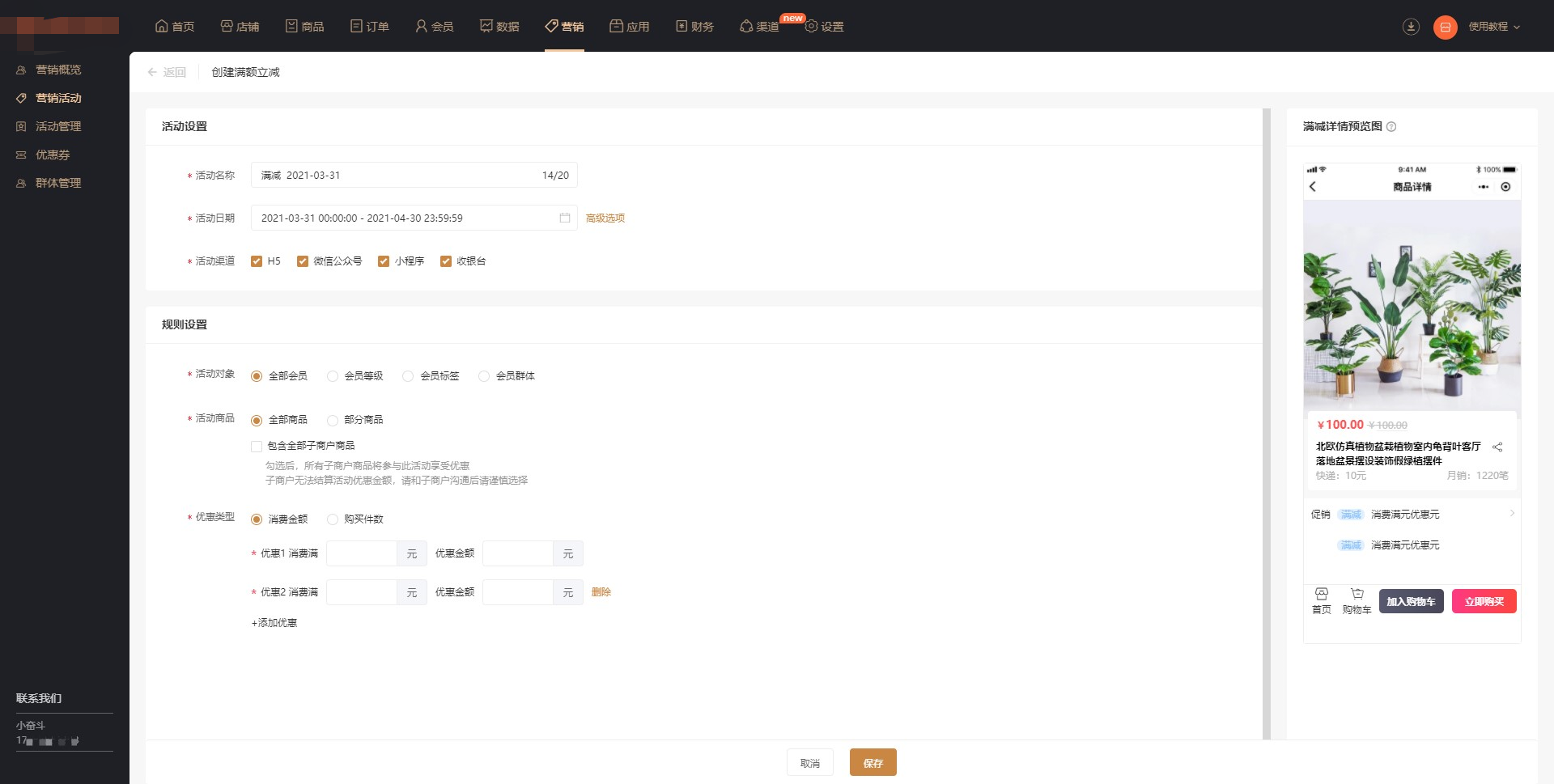 规则设置:选择活动对象和活动商品,优惠类型可选择消费金额或者购买件数