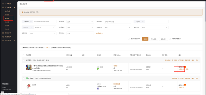 订单发货有两种方式、一种是单个发货,在商城后台找到对应的订单来进行发货;单个发货在订单管理里找到代发货的商品,然后找到对应的订单来发货,如图所示: