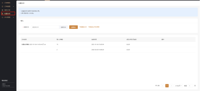 还有一种是批量发货,批量发货只适用于代发货的订单,在低昂单管理里找到批量发货。然后倒入订单的相关内容就可以了。可以通过下载模板辅助操作。