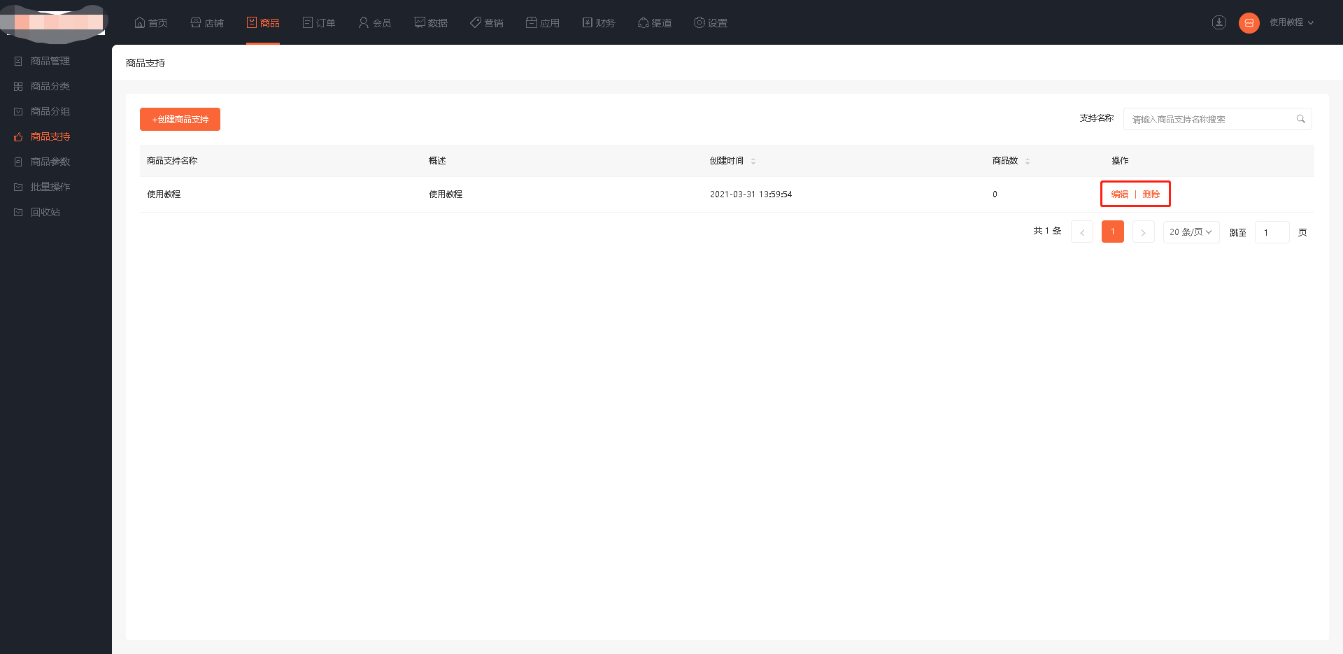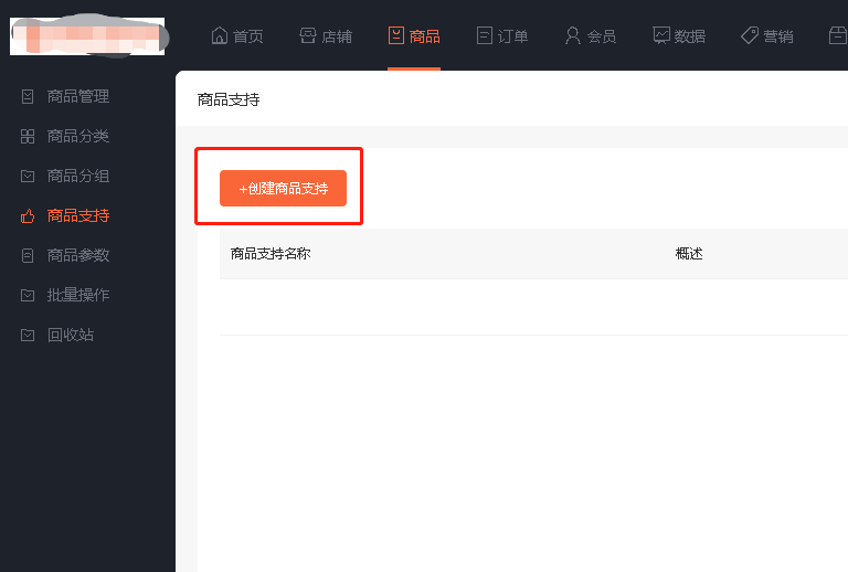 1、点击商品—商品支持—创建商品支持