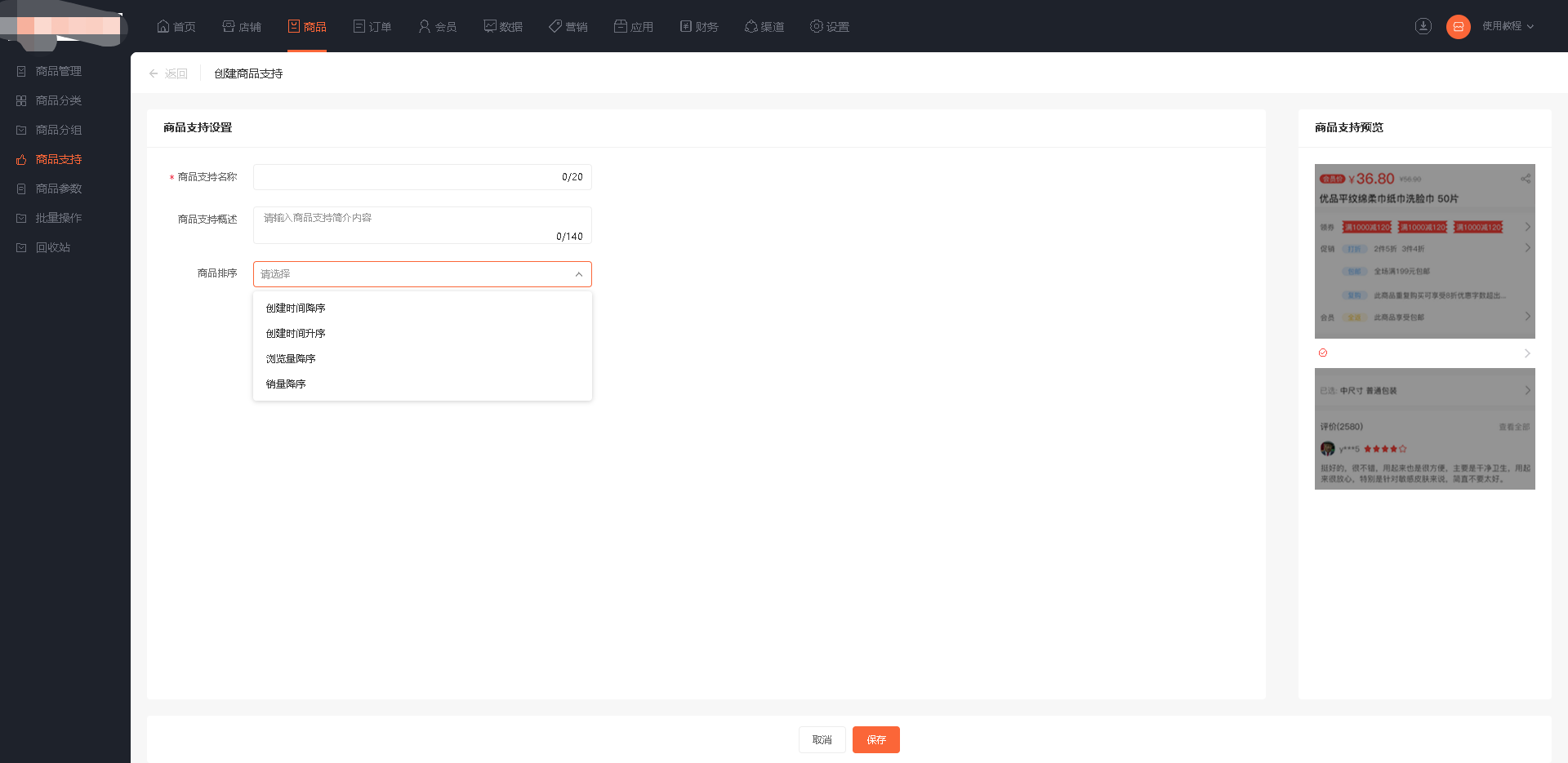 2、编辑商品支持信息,填写商品支持名称、概述及商品排序。