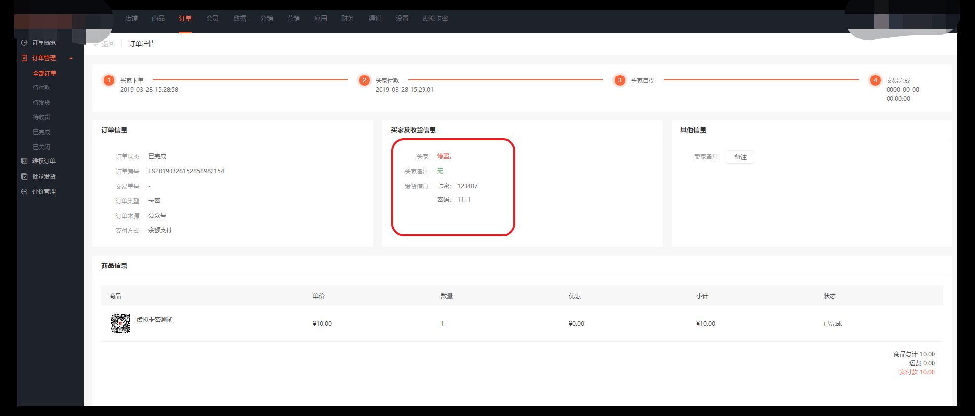 3、“已完成”的电子卡密订单,将在发货信息处展示此次出售的卡密数据,如图所示: