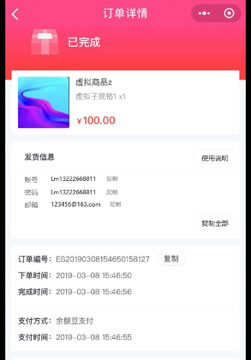 如上图所示,发货信息中,将此卡密的所有字段信息进行展示,并有复制按钮;