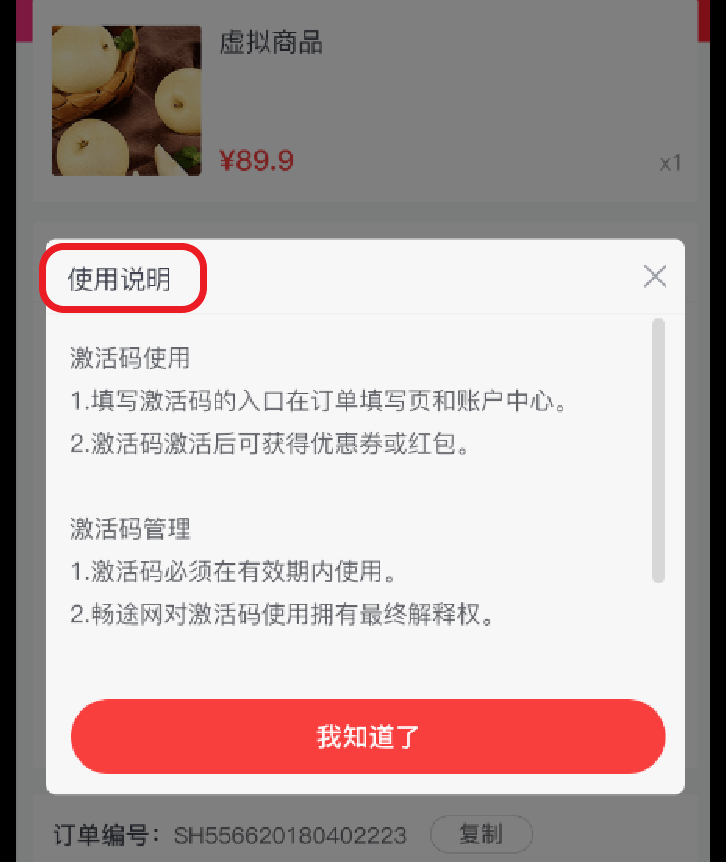 使用说明,点击弹窗显示该商品关联的卡密库的使用说明,若当前卡密库的使用说明为空,则此按钮不显示,使用说明如下图所示: