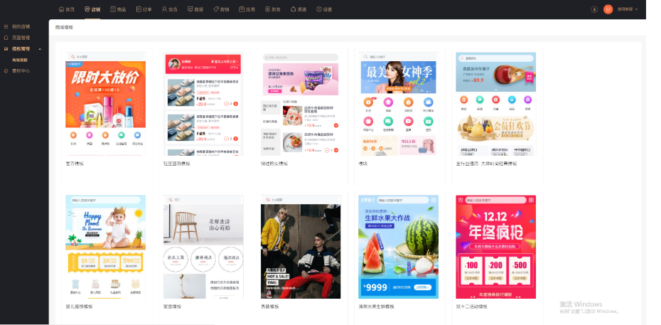 点击店铺模板,勾选需要的模板创建(模板需在管理端套餐中开启或用户中心购买)