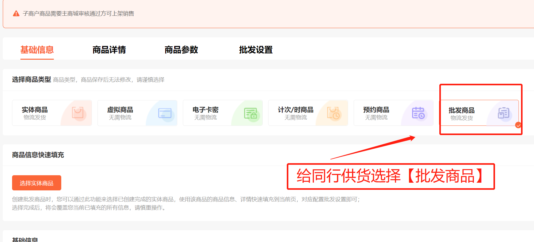 3.如您上传的商品给同行供货,请选择“批发商品”