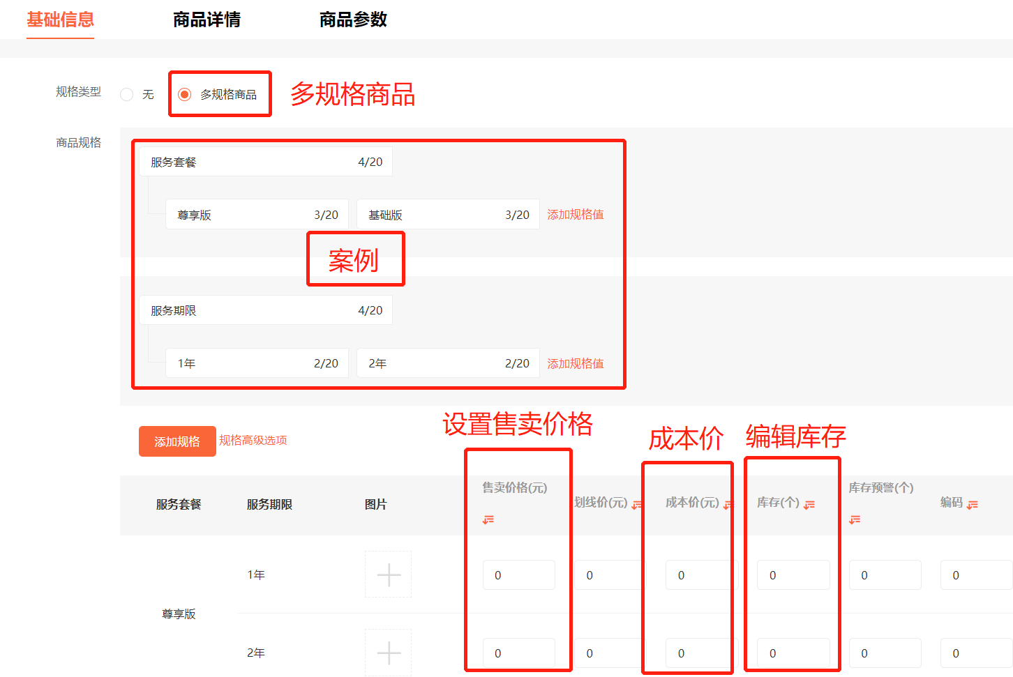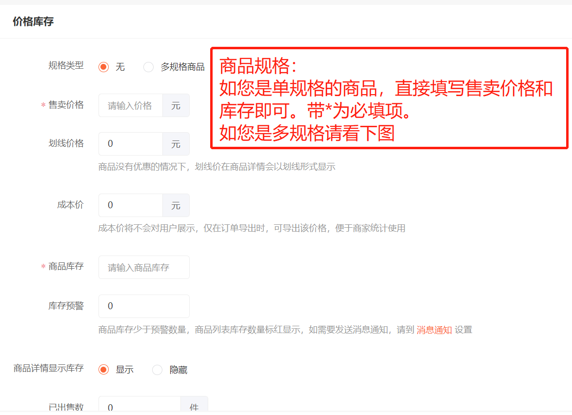 5.填写商品规格信息,单规格商品直接填写即可。多规格请下拉看图,根据不同的规格设置不同价格。