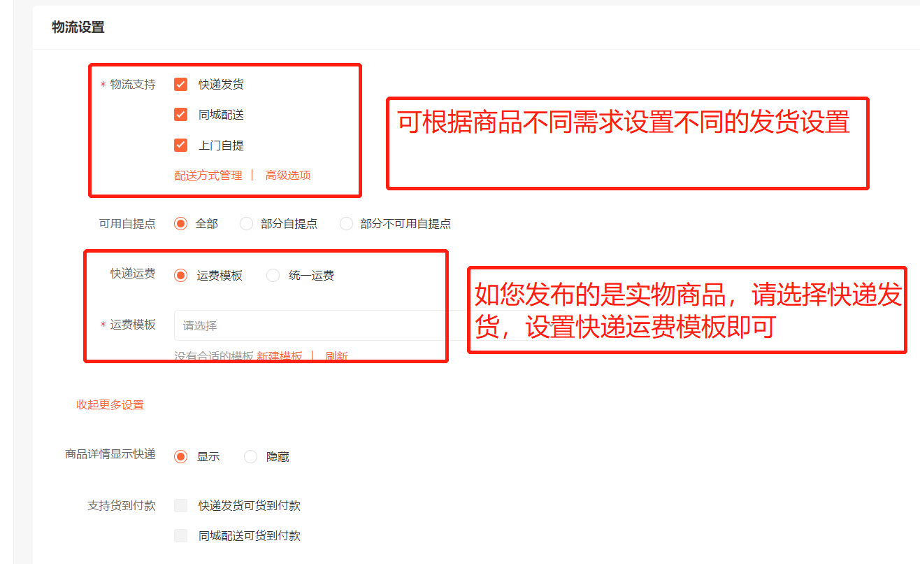 6.物流设置:根据不同的需求进行发货设置,如是虚拟类坑位等,选择上门自提即可。