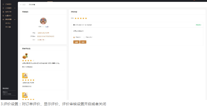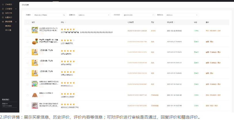 1. 评价列表:展示商品、评价、订单编号、买家、评价时间等信息;