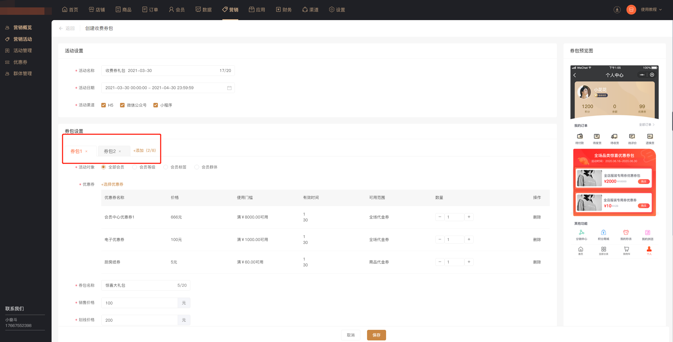 商家可根据自己的需求,灵活设置活动对象,自由设置每个券包中包含的优惠券,多种优惠券组合营销,增强活动趣味和创意。