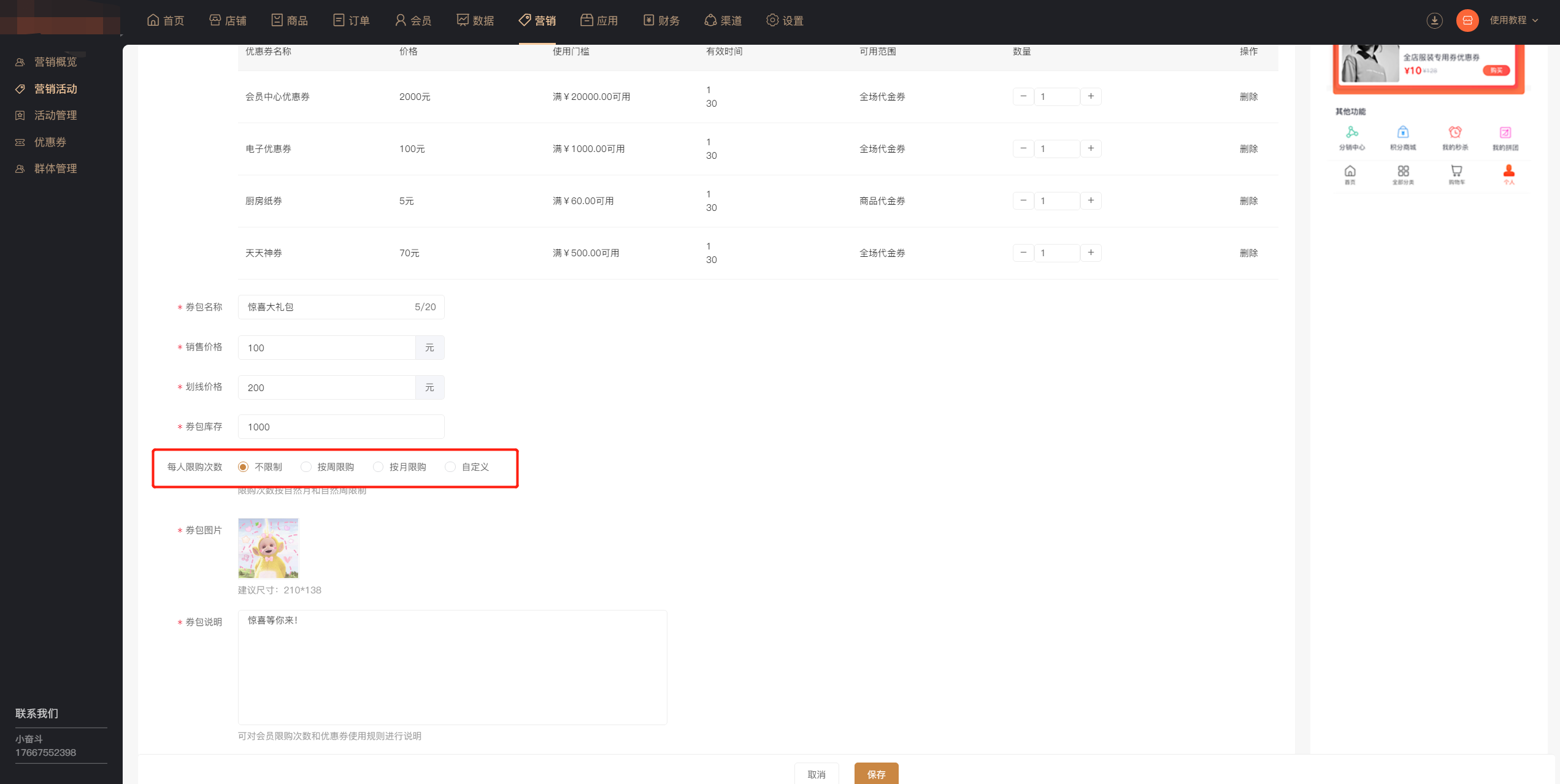 3、券包图片和活动说明商家可编辑修改,说明在手机端活动界面展示,方便会员了解活动规则。