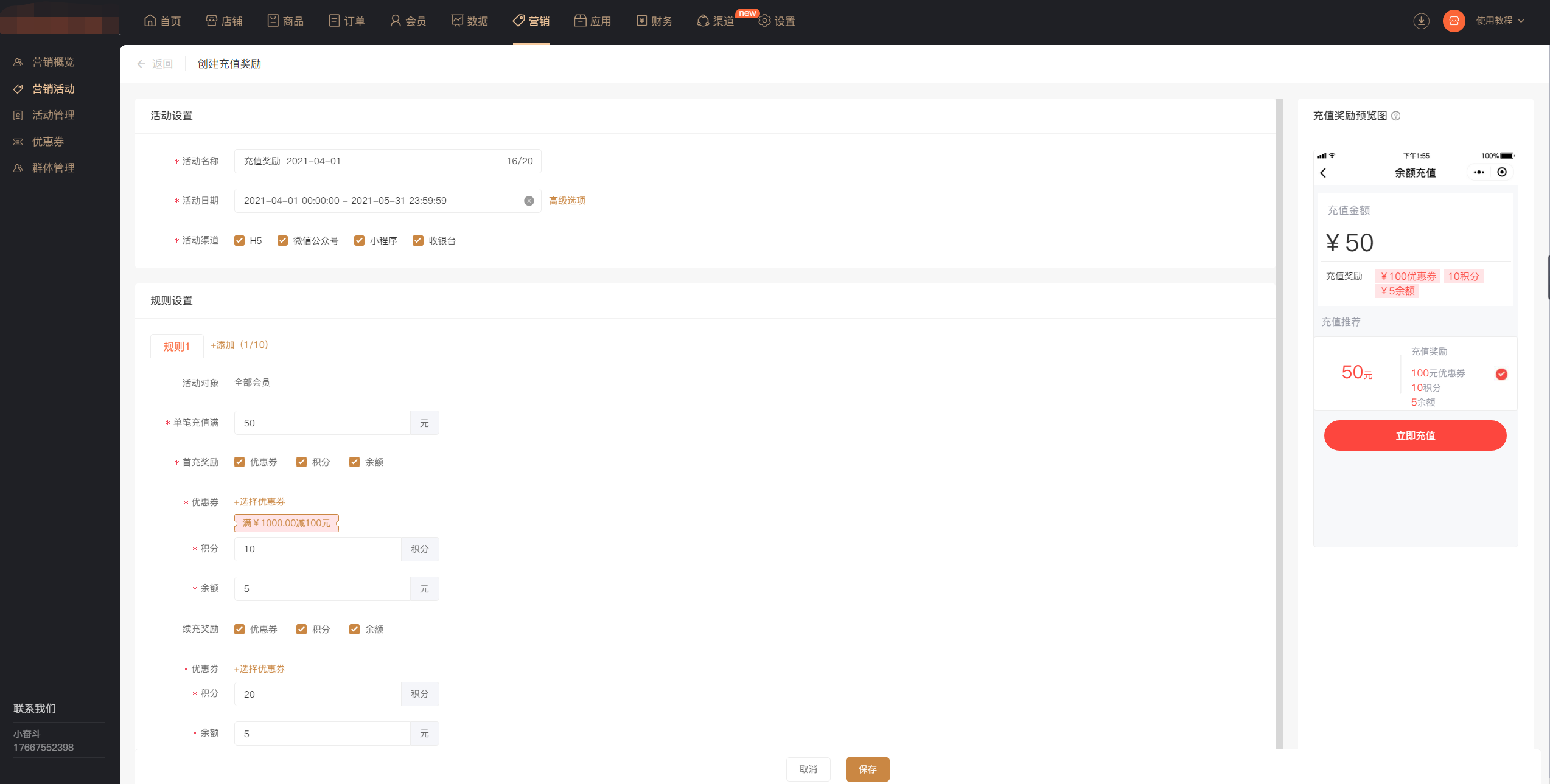 针对在商城或者收银台充值的会员,达到设置金额,即可获得优惠券、积分、余额奖励