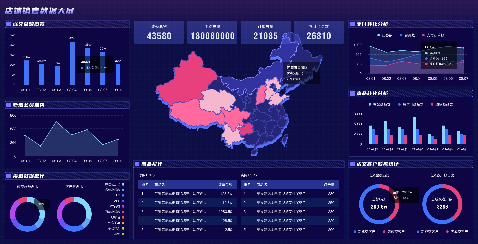 内容模块:成交总额概览、新增会员走势、渠道数据统计、商品排行、支付转化分析、商品转化分析、成交客户数据统计、会员分布地图、总数据概览